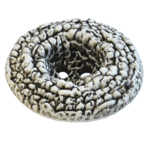 Der Knopf ist mittig um die Löcher tief geschüsselt und hat einen breiten Rand.